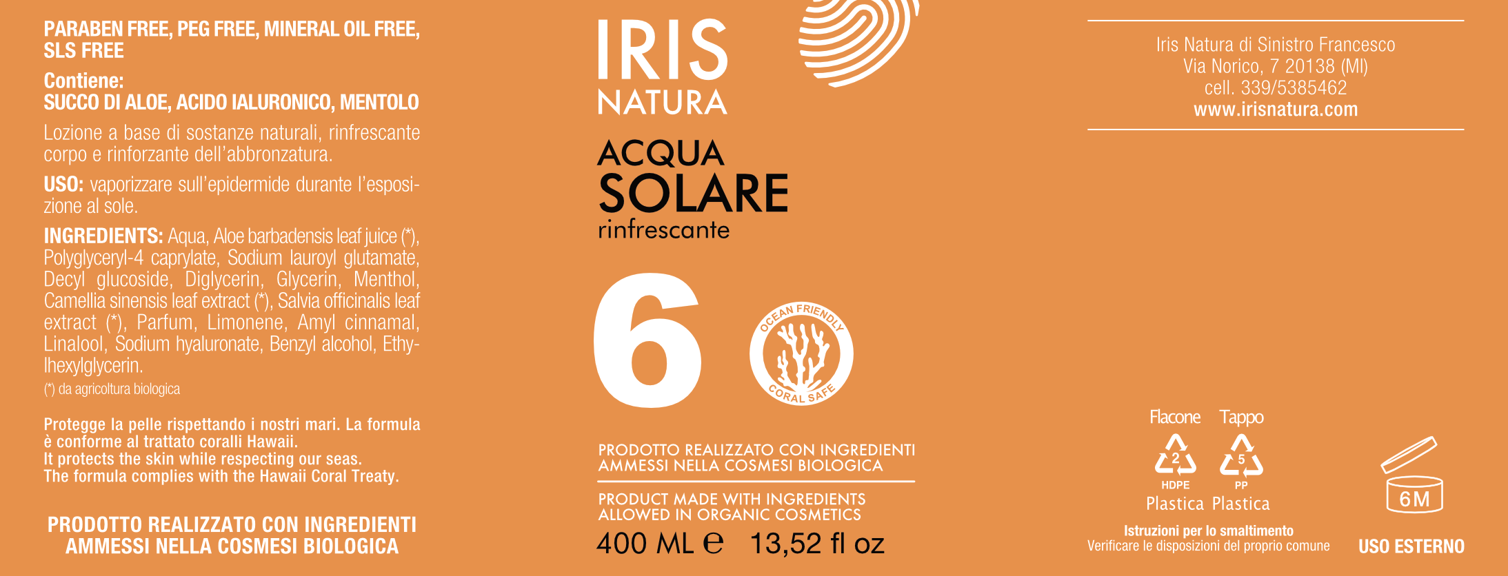 INGREDIENTI: Aqua, Aloe Barbadensis leaf juice (*), Polyglyceryl-4 caprylate, Sodium lauroyl glutamate, Decyl glucoside, Diglycerin, Glycerin, Menthol, Camellia sinensis leaf extract (*), Salvia officinalis leaf extract (*), Parfum, Limonene, Amyl cinnamal, Linalool, Sodium hyaluronate, Benzyl alcohol, Ethylhexylglycerin (*).